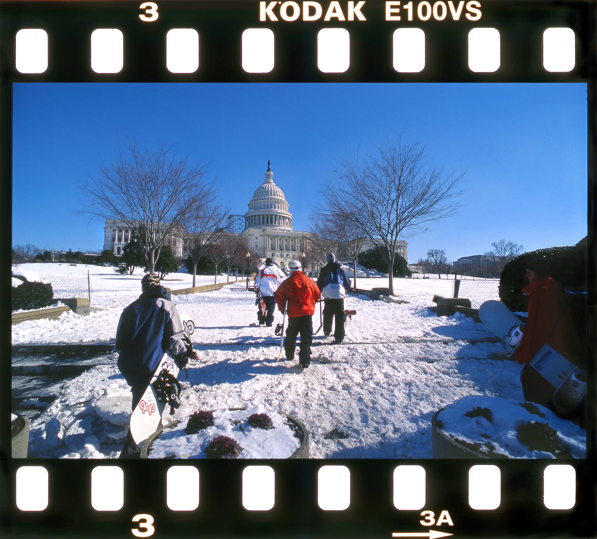 In the early 90s street boarding was called the new-school age of snowboarding. The huge craze was rails; rail clips were everywhere. Somewhere between ’95-’99 rails fell out and all riders focused on were big jumps and cliffs. Then another pivot, and in 2000 handrails became cool again and never fell off from there. Whitey called these “East Coast rail missions.” He brought a few riders out from the West Coast to his hometown of Washington D.C. when it got dumped on with snow. While District employees were shoveling snow off of walkways, Whitey and Kingpin Productions were moving snow to make lines possible. During the filming of ‘Destroyer’ Mikey Leblanc famously slid the handrails of the United States Capitol Building. Kingpin also targeted other “missions” in New York City, Cleveland, Philadelphia, and Cincinnati.